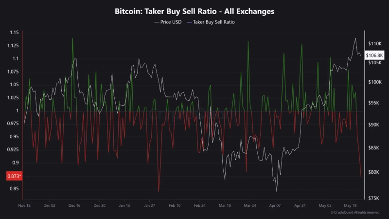 On the 26th (local time), a Crazzyblockk Santiment analyst reported, "On-chain indicators suggesting the possibility of a short-term adjustment in the virtual asset market are emerging," and added, "The taker buy and sell volumes on centralized exchanges (CEX) have both significantly decreased." He continued, "This indicates a decrease in the market order ratio on both the buy and sell sides, suggesting a weakening of the market's short-term momentum."