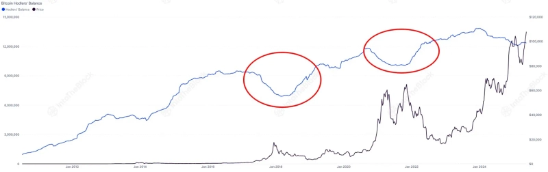 On the 26th (local time), Centora (formerly IntoTheBlock) stated on X (formerly Twitter), "Long-term holders tend to accumulate during bear markets and sell during bull markets," and "As a result, on-chain charts form a symmetrical bowl-shaped pattern."