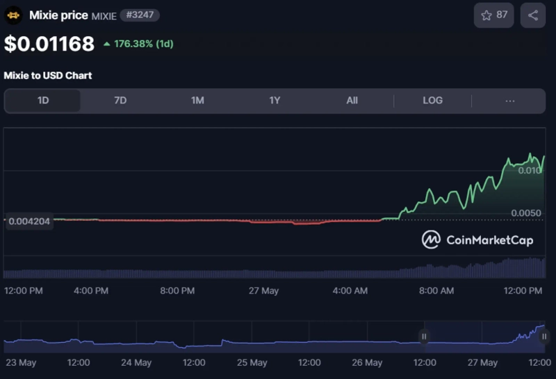 Meme coin Mixie (MIXIE) is showing a significant surge intraday.