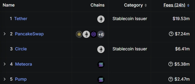 During the same period, Tether recorded a total fee revenue of $19.53 million, securing the 1st position. Following PancakeSwap in 2nd place were USDC ($6.41 million), Meteora ($5.38 million), and PumpFun ($2.47 million).