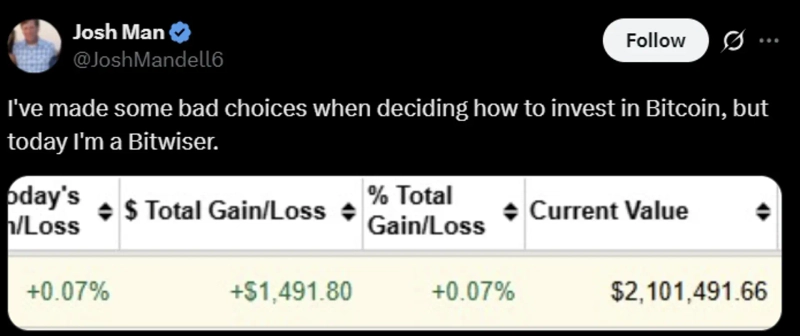On the 27th (local time), renowned hedge fund investor Josh Mandel stated on his X (formerly Twitter), "I have invested in Bitcoin in a not-so-good way until now, but from today, I am a Bitwiser."