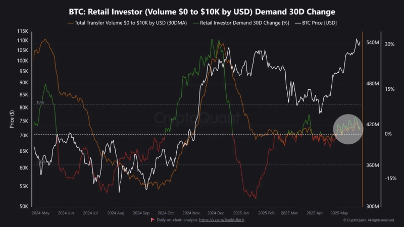 According to the data, Bitcoin's price (white line) continues to show an upward trend. However, the '30-day change rate of individual demand (green line)' shows little change. This indicates that individual investor buying pressure has not influenced the rise in Bitcoin prices.