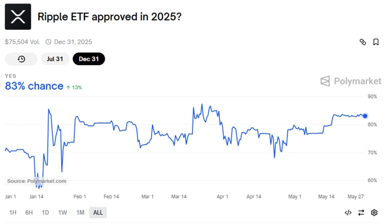 - Polymarket reports that the probability of XRP spot ETF approval is 83%, with expectations rising by 21% over the past month.