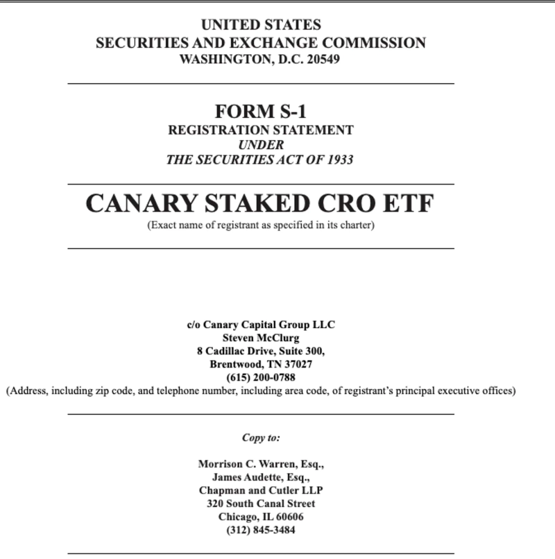 Canary Capital Group LLC Submits S-1 Filing for Canary Staked CRO ETF