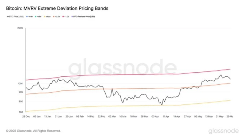 Glassnode explained, "Currently, Bitcoin is trading in the range of +0.5 standard deviation ($102,000) to +1 standard deviation ($119,400) based on the MVRV metric," and added, "This range has frequently been observed before short-term price corrections in the past."