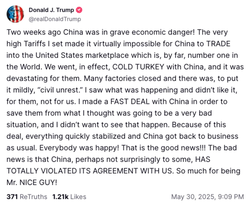 Trump: "Helped China... But Completely Violated Tariff Agreement With United States"