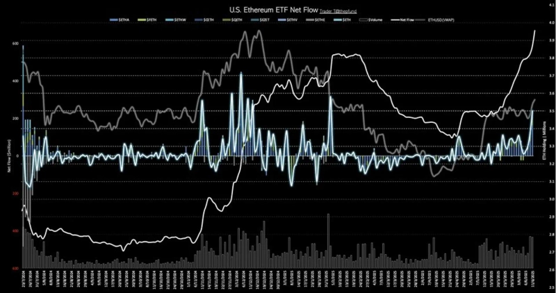 The U.S. Ethereum (ETH) spot ETF recorded a net inflow exceeding $200 million the previous day, marking the largest inflow in four months.