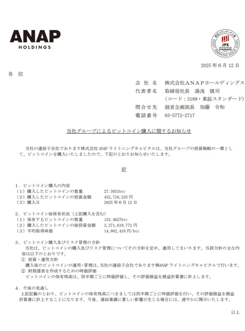 "Japanese listed company ANAP purchases an additional 50.56 BTC in two days, surpassing 153 BTC in holdings"
