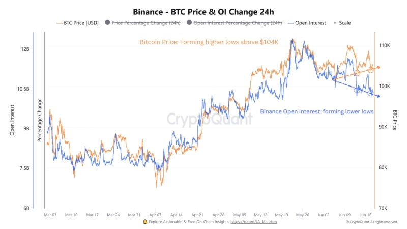 On the 19th (local time), CryptoQuant analyst Amr Taha analyzed, "On Binance, while the BTC price has repeatedly formed the same low point above the $104,000 level, confirming strong support, Bitcoin OI has continuously set even lower lows, indicating that a gradual deleveraging process is underway across the derivatives market."