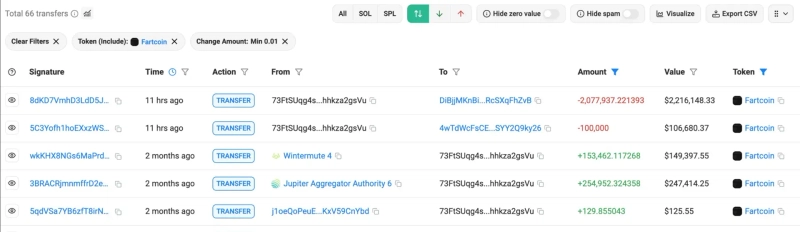 According to Lookonchain X on the 20th (local time), address '73FtSU' sold all of its 2.18 million FARTCOIN, which had been purchased two months ago at an average price of $1.06 (USD), today for approximately $2.3 million.