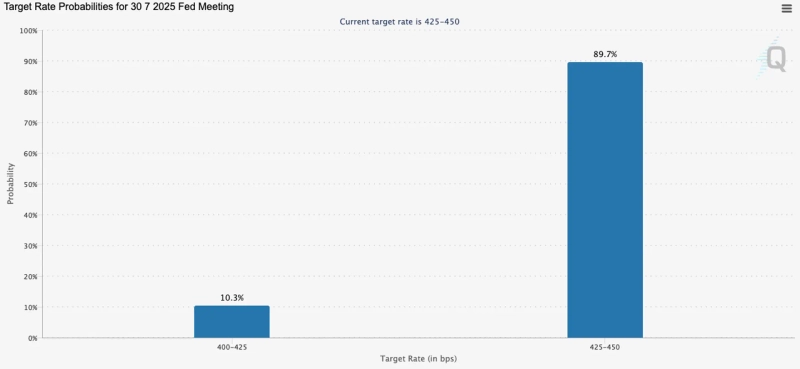 Meanwhile, according to CME FedWatch as of 11 a.m. that day, the probability that the Fed will hold rates unchanged in July is 89.7%. The first rate cut is expected in September, with a 64.7% probability.