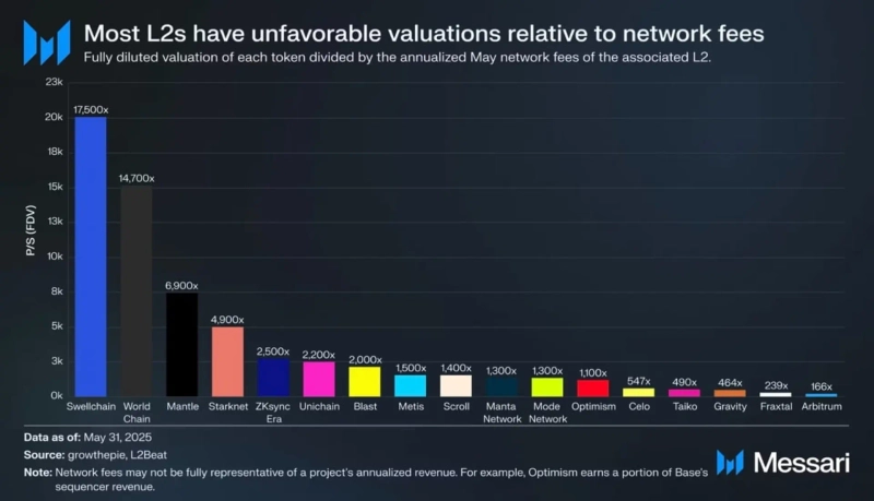 Swell Chain (SWELL) earns only tens of thousands of dollars annually, yet boasts a market cap exceeding $100 million. The enterprise value-to-sales ratios for projects like Optimism, StarkNet (STRK), and zkSync (ZK) also range from 1,000 to 5,000 times. That is, most tokens are overvalued purely on anticipation, lacking a realistic revenue model.