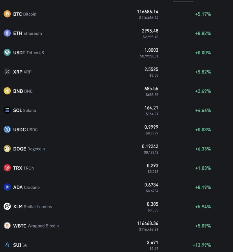 The virtual asset (cryptocurrency) market is showing an overall upward trend. Bitcoin (BTC) has risen by more than 5% compared to the previous day and is trading in the $116,000 range. Major altcoins such as Ethereum (ETH), Cardano (ADA), and Sui (SUI) are also showing strong performances.