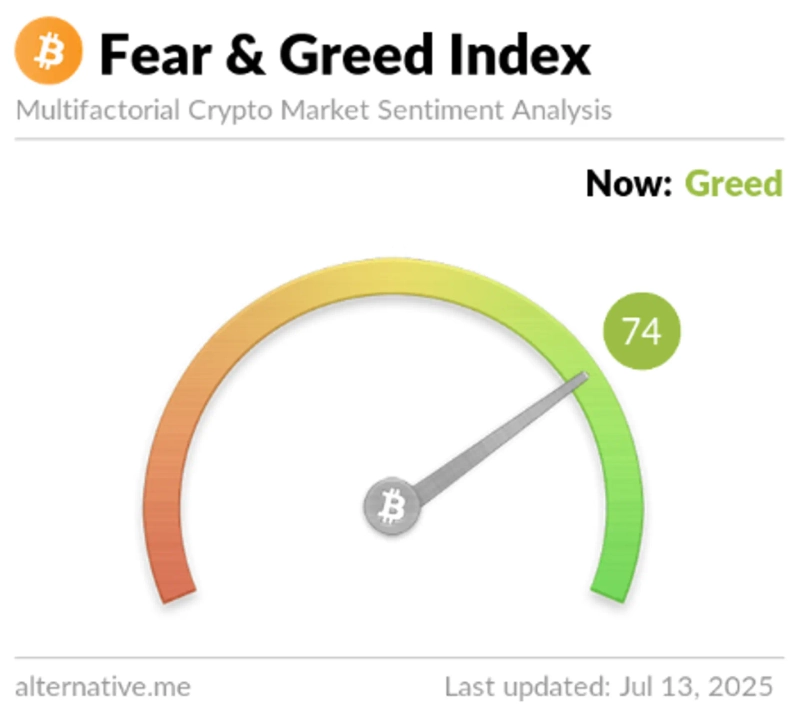 On the 13th (local time), the Fear & Greed Index provided by the virtual asset analysis firm Alternative currently stands at 74 out of 100, entering the 'greed' stage. The index dropped by 5 points from the previous day's 'extreme greed' level (79 points), hinting that market speculation is calming down.