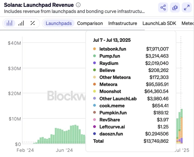 According to the attached data, Letsbonk.fun’s revenue last week reached approximately $7.97 million, while Pump.fun recorded $3.21 million.