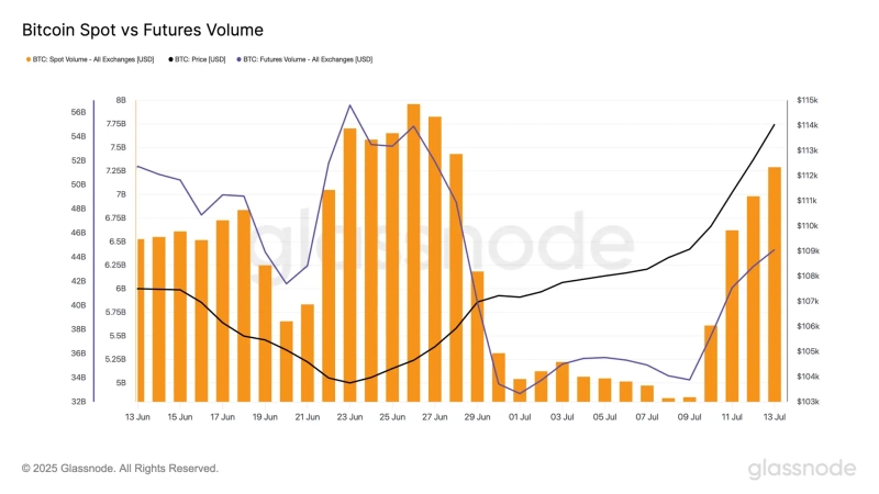 On the 14th (local time), Glassnode stated via X (formerly Twitter), "Since the 9th, both perpetual futures and spot trading volumes of Bitcoin have risen sharply," adding, "This is a sign that overall market interest in Bitcoin has increased."