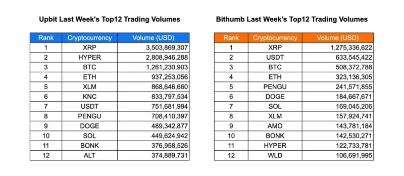 Trading activity on Upbit was marked by strong speculative momentum in mid-cap tokens like HYPER, PENGU, and BONK, each surpassing a combined $1.5 billion. Bithumb showed a relatively balanced distribution, with PENGU, AMO, and BONK in the top 10, suggesting growing user participation in altcoins outside the major market caps.
