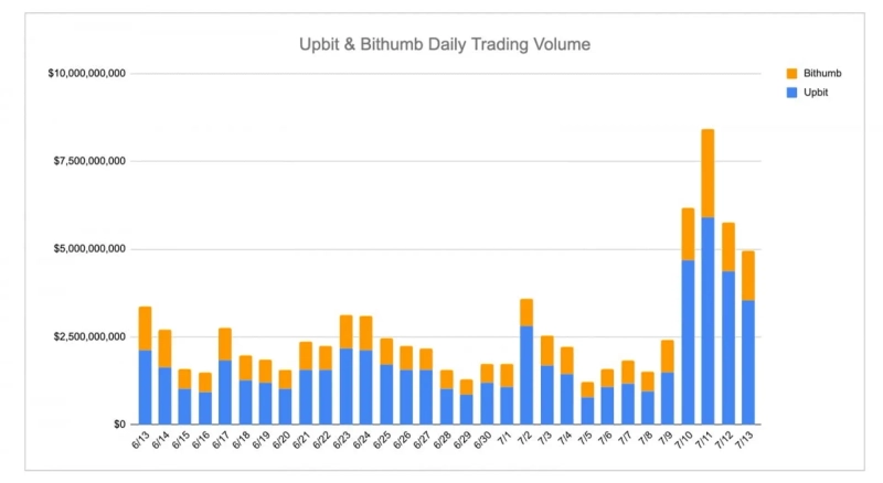 Since July 10, daily volumes have soared, with Upbit contributing the most to the record high of about $9 billion on July 11. This spike appears to coincide with broad retail inflows and heightened volatility across the altcoin sector. Overall, Upbit maintains its lead in trading volume, especially with notable activity in new and small-cap assets.