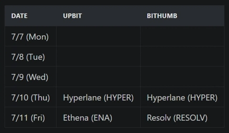 Upbit and Bithumb saw a notable surge in trading volumes last week, peaking on July 11. On Upbit, XRP alone posted over $3.5 billion in weekly trading volume, followed by HYPER ($2.8 billion), BTC ($1.26 billion), and ETH ($937 million). On Bithumb, XRP topped with $1.28 billion, followed by USDT ($633 million) and BTC ($508 million). This indicates both exchanges continue to show a preference for high-liquidity tokens.