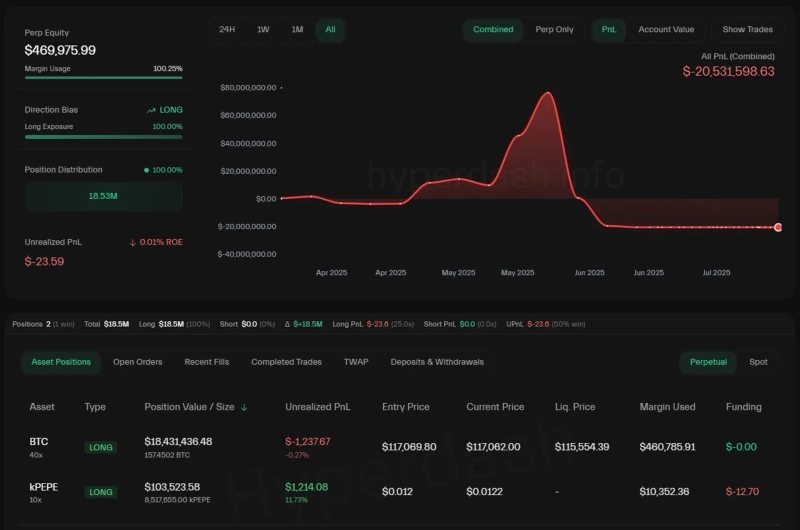 On the 15th (local time), OnchainLens disclosed on X (formerly Twitter), "James Wynn deposited $467,999 into Hyperliquid and then established a 40x long position in Bitcoin, looking as if he has returned to the battlefield." The position size is $18,430,000, with an entry price of $117,069 and a liquidation price of $115,554.