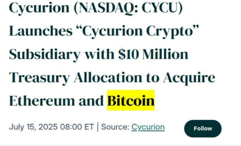 Cycurion (Cycurion), a company listed on the Nasdaq in the United States, plans to invest $10 million to purchase Bitcoin (BTC) and Ethereum (ETH).