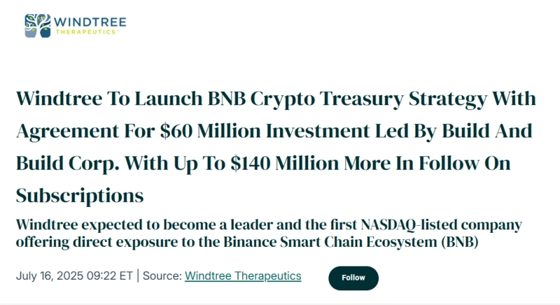 According to GlobeNewswire on the 16th (local time), Windtree stated in a press release that it "plans to raise up to $200 million to reserve Binance Coin (BNB)" and has already "signed a stock purchase agreement worth $60 million with Build and Build Corp."