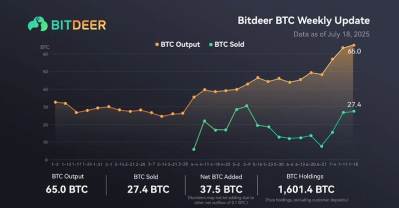 Bitdeer, a Bitcoin (BTC) mining company, has reportedly mined 65 BTC over the past week and sold 27.4 BTC during the same period.