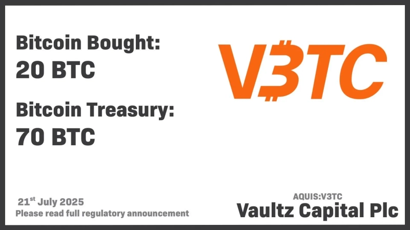On the 21st (local time), Vaultz Capital Plc announced via X (formerly Twitter) that it had secured an additional 20 BTC. The company now holds a total of 70 bitcoins.