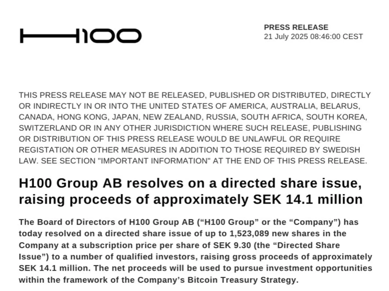 Swedish health company 'H100 Group', which has adopted a Bitcoin (BTC) accumulation strategy, has raised an additional 14.1 million kronor (approximately $1.47 million).