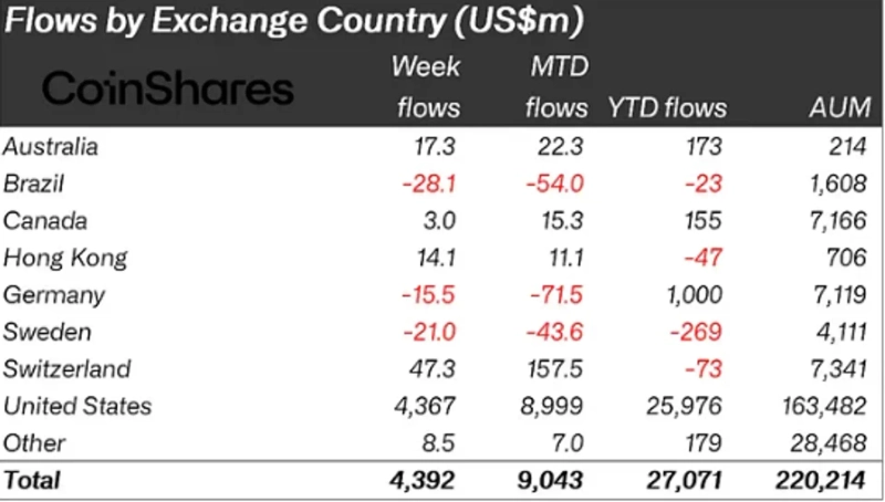 By country, the United States led inflows. U.S.-based digital asset investment products alone drew approximately $4.367 billion in net inflows, while Switzerland, Hong Kong, and Australia saw inflows of $47.3 million, $14.1 million, and $17.3 million, respectively. In contrast, Brazil and Sweden recorded net outflows of $28.1 million and $21 million, respectively.