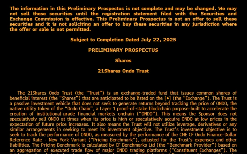 The virtual asset (cryptocurrency) manager 21Shares has reportedly submitted an application (S-1) for an Ondo Finance (ONDO) Exchange Traded Fund (ETF).