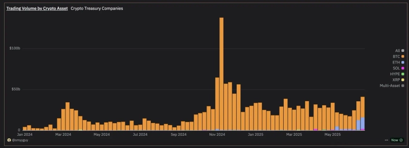 - Companies accumulating Ethereum (ETH), led by SharpLink Gaming and BitMine, accounted for 34% of the total trading volume.
