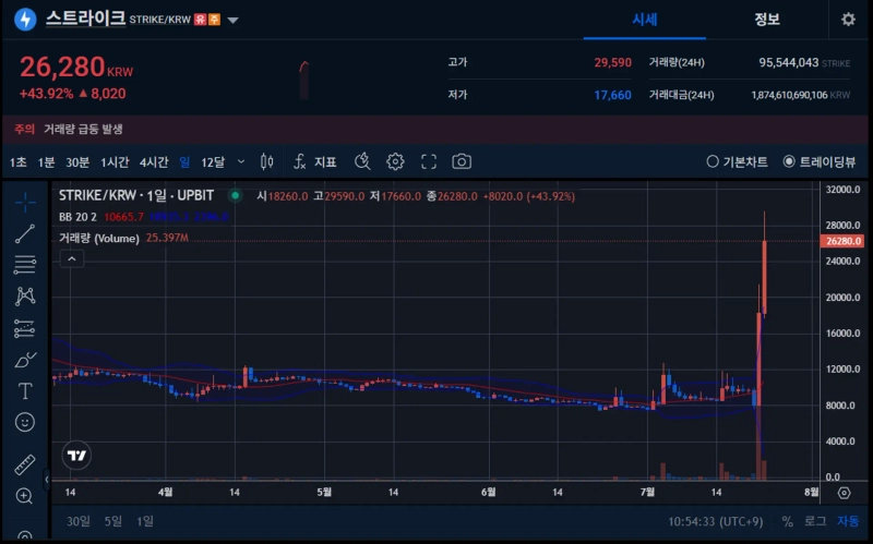 According to Upbit on the 23rd (local time), at 10:56 AM, Strike was trading at ₩26,280, up 43.92% from the previous day. This marks an astonishing 268% surge over the past two days.