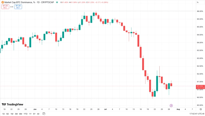 - Over the past month, Bitcoin dominance fell by 6.30 percentage points, breaking below the upward trendline that had persisted for three years.