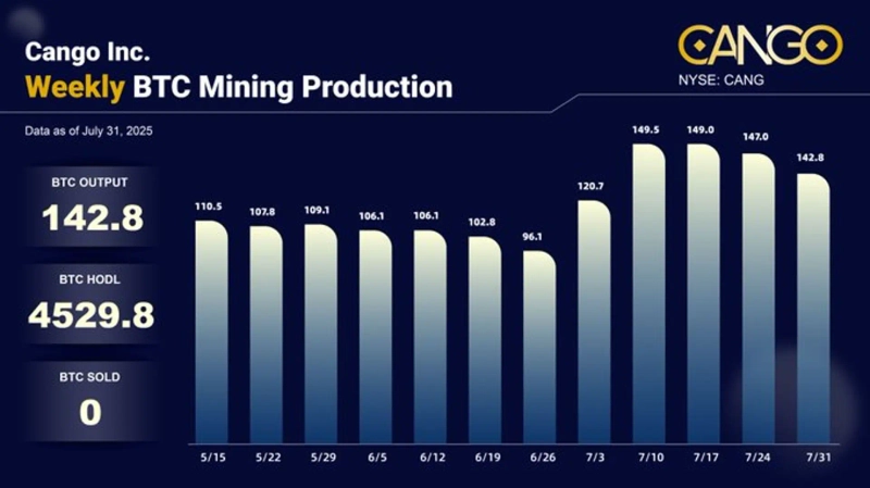 Chinese auto trading platform Cango mined 142.8 Bitcoin (BTC) in the past week, increasing its total holdings to 4,529.8 BTC.