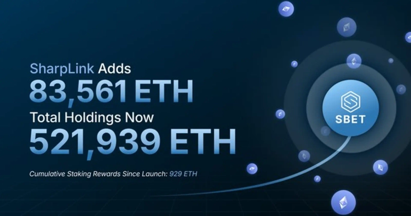 U.S.-listed company SharpLink Gaming, Inc. announced that it has expanded its cumulative Ethereum (ETH) holdings to 521,939. All ETH held are currently staked.