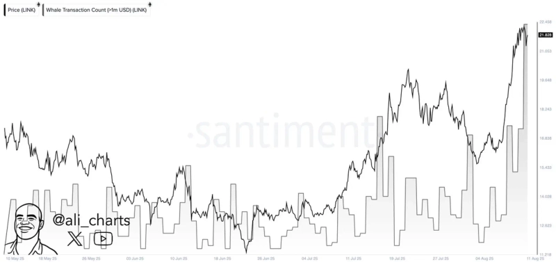 On the 13th (local time), cryptocurrency analyst Ali Martinez stated on X (formerly Twitter), "The trading volume of Chainlink whales has surged," adding that "this is at the highest level in three months."