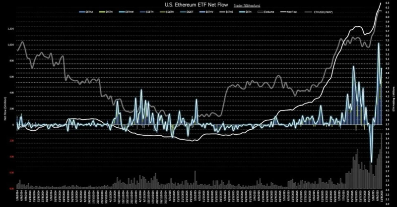 According to TraderT on the 14th (local time), U.S. Ethereum spot ETFs recorded a net inflow of $704.32 million (about ₩975 billion) the previous day. This marks seven consecutive trading days of net inflows.