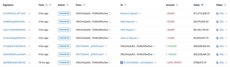 According to Lookonchain on the 14th (local time), whale investor 'CMJiHu' deposited 130,000 SOL (worth approximately $26.45 million) into Binance, OKX, Bybit, and Gate.io.