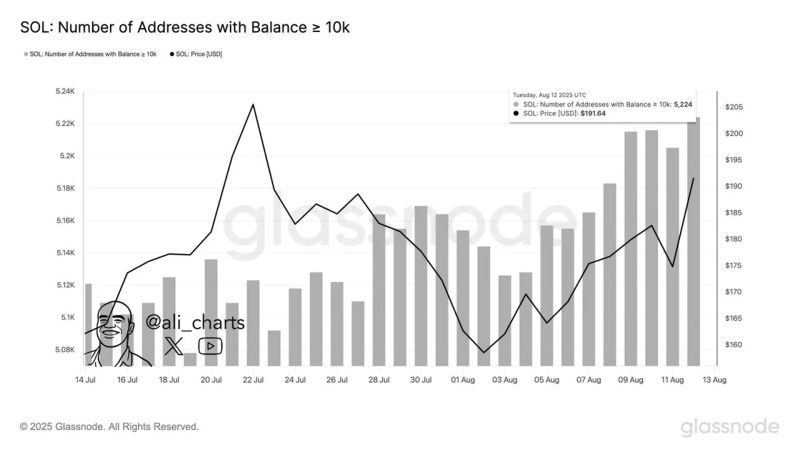 On the 15th (local time), Ali Martinez, a cryptocurrency analyst, stated on X (formerly Twitter), "The number of wallets holding more than 10,000 Solana (approximately $2,000,000) has reached 5,224," adding, "This is the highest number ever."
