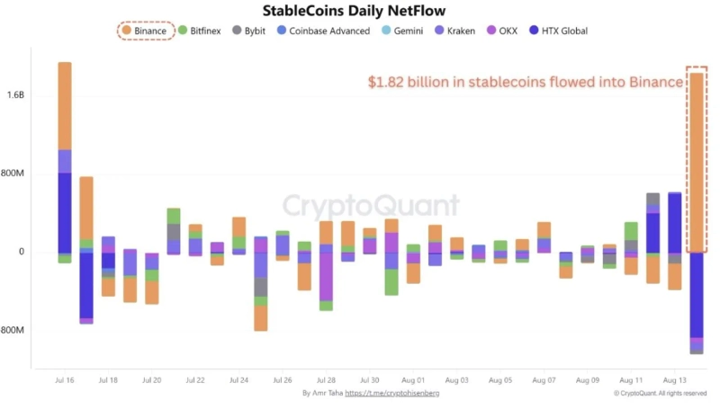 On the 15th (local time), CryptoQuant announced via X (formerly Twitter), "Stablecoins worth $1.82 billion have flowed into Binance," adding, "This suggests that the probability of a price increase has risen."