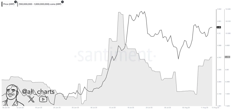 On the 14th (local time), cryptocurrency analyst Ali Martinez announced via X (formerly Twitter), "During the past 72 hours, whales have accumulated 320 million XRP." This amount, based on the current XRP price, is valued at $1 billion (approximately ₩1,392,300,000,000).