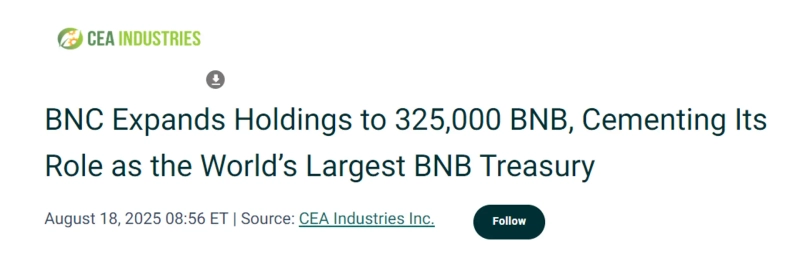 According to a press release on the 18th (local time) by GlobeNewswire, CEA Industries stated, "We have additionally acquired 125,000 BNB" and added, "We are currently holding 325,000 BNB." They also mentioned, "We are the world’s largest holder of BNB."