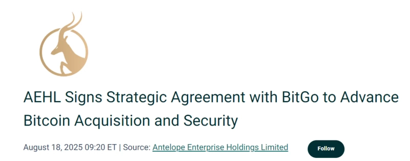 Antelope Enterprise Holdings, which is listed on Nasdaq, has entered into a strategic partnership with cryptocurrency custody company BitGo.