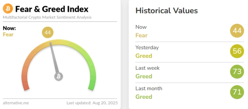 On the 20th (local time), the Fear & Greed Index provided by the virtual asset analytics firm Alternative currently stands at 44 out of 100, entering the 'fear' stage. The index declined by 12 points from the previous day (56 points), showing decreased investor sentiment in the market.