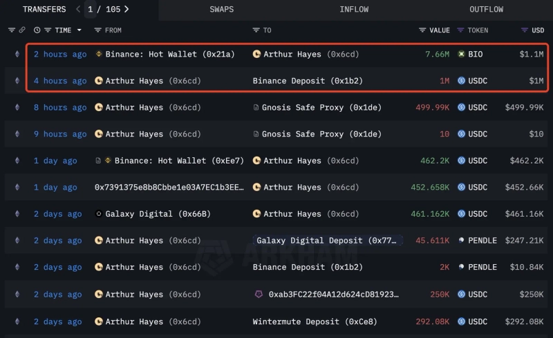 On the 20th (local time), Lookonchain announced on X (formerly Twitter), "About two hours ago, Arthur Hayes bought 7.66 million BIO," adding, "This amounts to approximately $1 million."