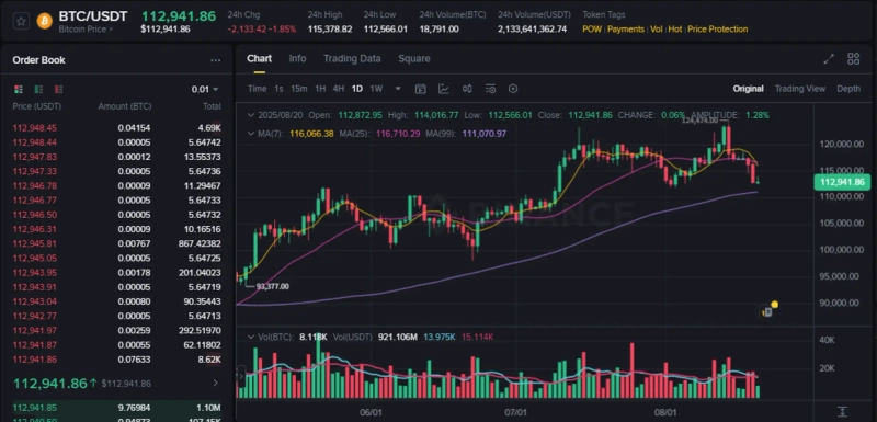 As of 10:46, based on the Binance USDT market, Bitcoin is trading at $112,941, down 1.85% from 24 hours ago.