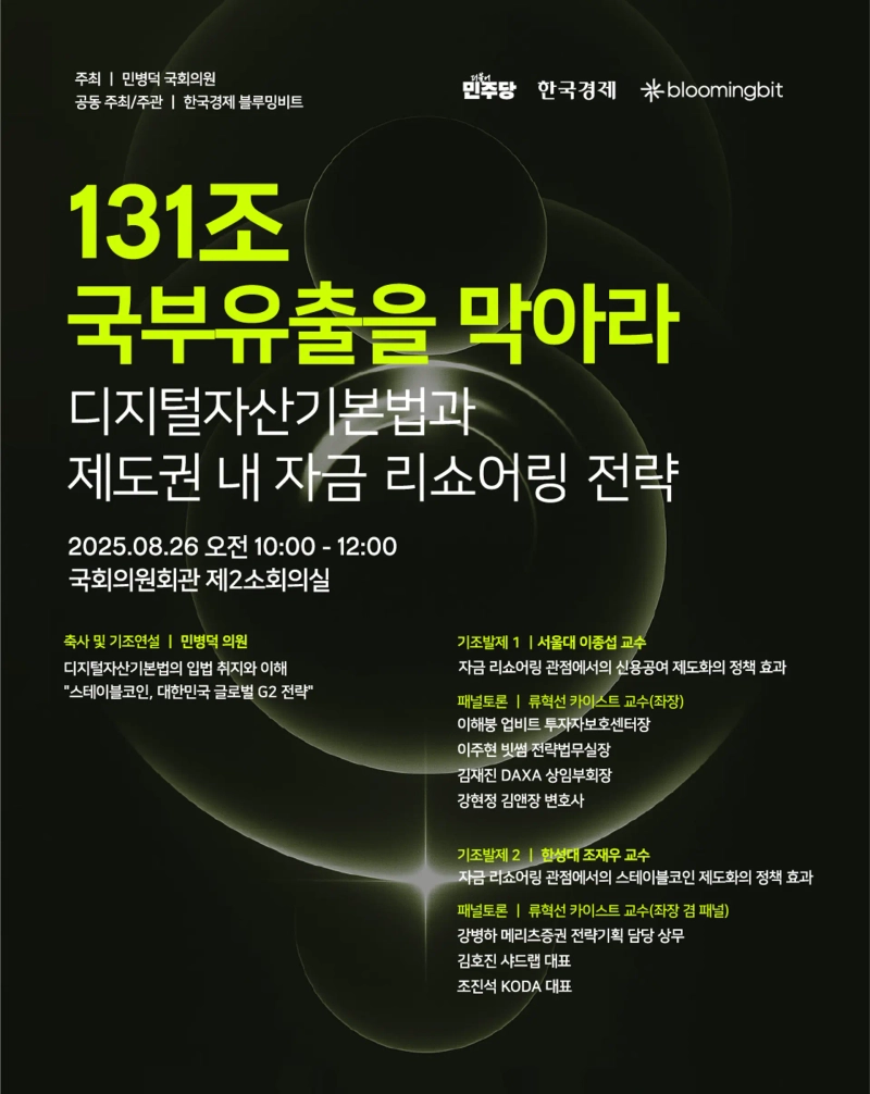 - The seminar will discuss key issues in the digital asset industry such as credit provision, KRW stablecoins, preventing outflow of national wealth, and capital reshoring strategies.