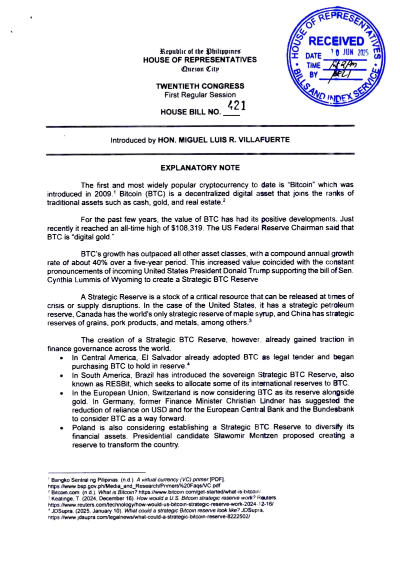 A bill has been submitted in the Philippine House of Representatives to establish a national-level Bitcoin (BTC) reserve.