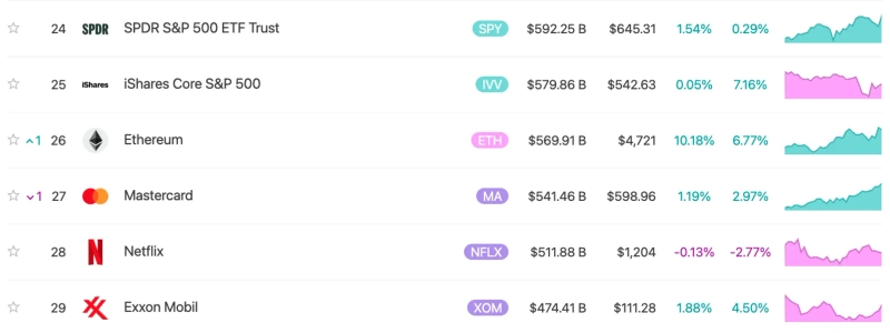 Ethereum (ETH) has risen to 26th place in the global asset market capitalization rankings, overtaking Mastercard.